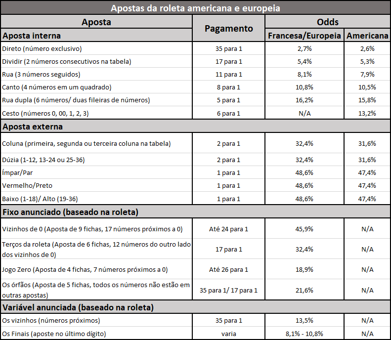 Existe una probabilidad de ganar cada una de las apuestas que se han enumerado, y la siguiente tabla presenta cada una de estas posibilidades de manera muy simple: cuanto más difícil, mayor es su rendimiento en casinos y casas de apuestas.
